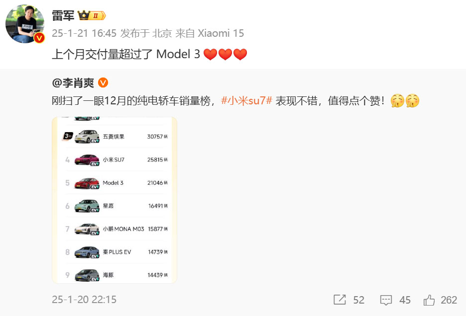 レイ氏は、シャオミEVの副社長であるリー・シャオシュアン氏がシェアした、地元の自動車メディア「東車地」による去年12月の電気自動車セダンの販売台数ランキングをリツイートした際に、このコメントを投稿しました。