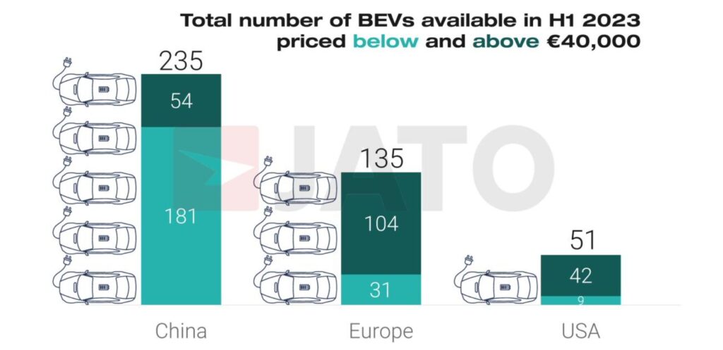 中国のEV普及率の加速は、非常に手頃な価格のモデルがより多く選択肢として存在すること、そして欧州やアメリカと比較して、中国ではEVがかなり安価であることの直接的な結果です。JATOダイナミクス社のデータによると、2023年上半期に中国で販売されたEVのほぼ80%が4万2000ドル(4万ユーロ)未満であり、そのうち3分の1は2万1000ドル(2万ユーロ)未満でした。