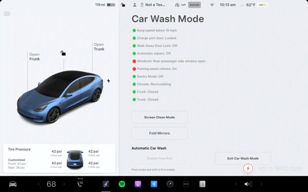 今回のアップデートにより、洗車モードが改良されました。洗車モードを起動すると車の窓は閉まりますが、モード起動後に車内の誰かが窓を開けた場合、ドライバーには開いた窓についての警告が表示されませんでした。