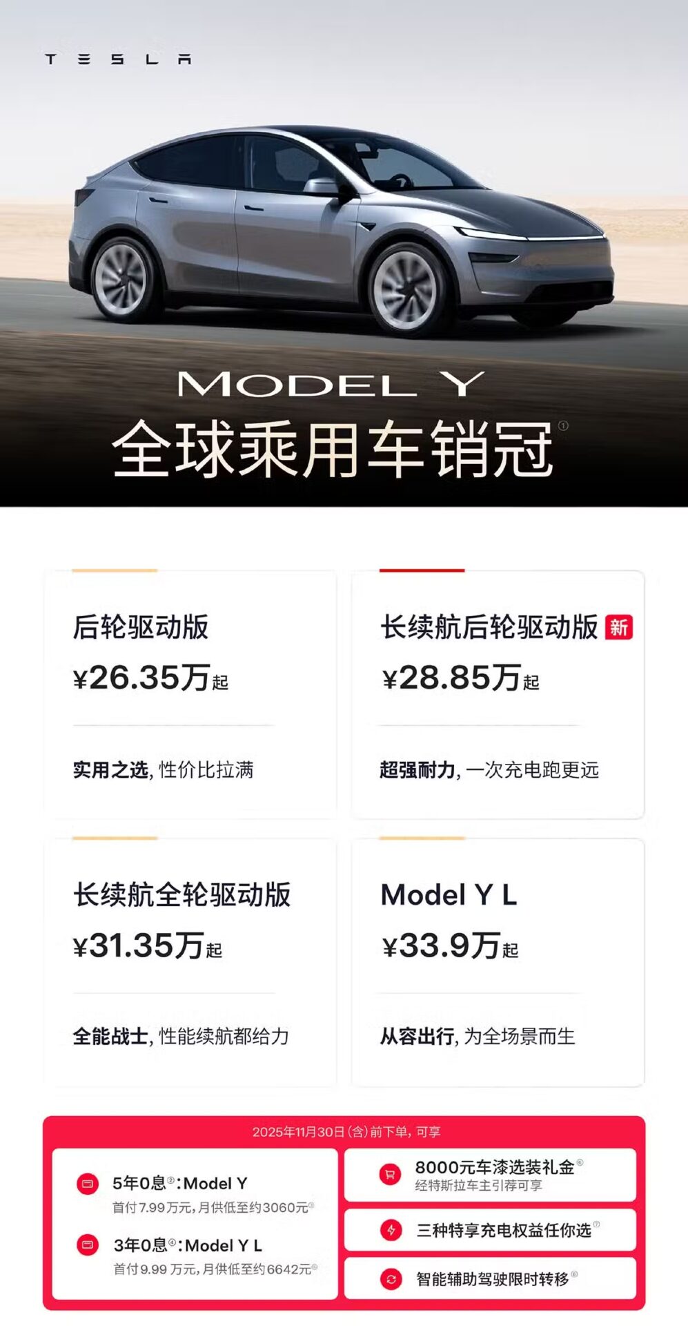 他の5人乗りモデルYと同様、テスラはこの新しいモデルYに対し、5年間の0%金利ローンや8,000人民元相当の塗装カスタマイズクレジットなどの特典を提供しております。6人乗りモデルY Lには3年間の0%金利ローン特典が適用されます。