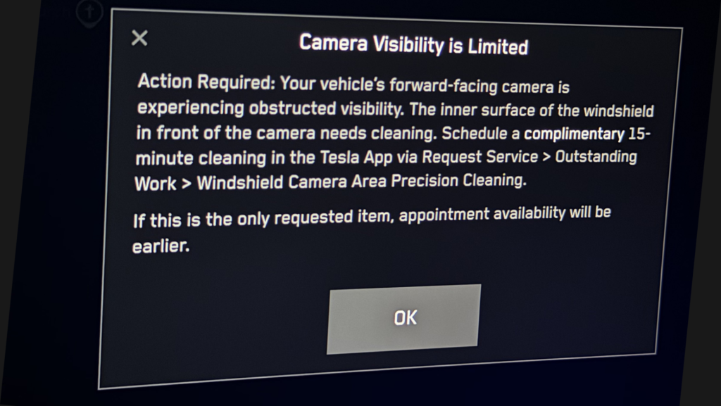 「車の前方カメラの視界が遮られています。カメラ前面のフロントガラス内側の清掃が必要です。テスラアプリで『サービス依頼』>『未完了作業』>『フロントガラスカメラエリア精密清掃』より、無料の15分間清掃をご予約ください」