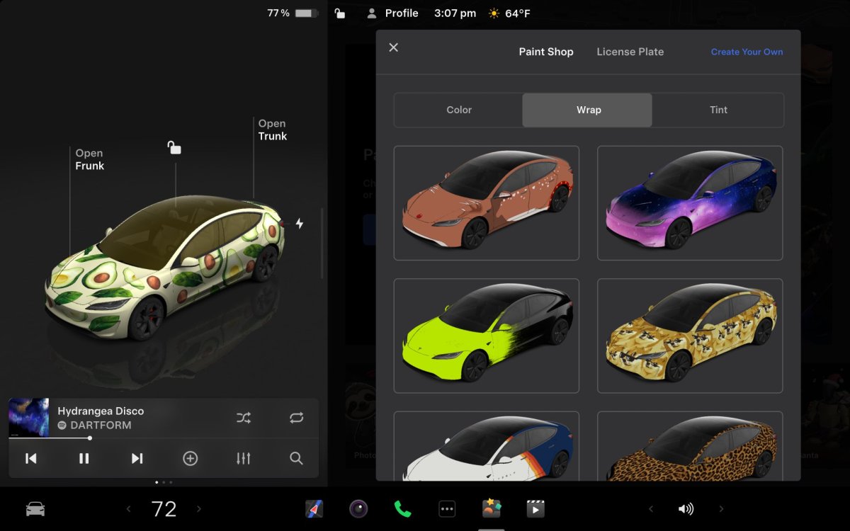 全車モデル向けに、待望のカスタムラップとナンバープレートが遂に現れました。当初は2024年ホリデーアップデートでサイバートラックに初登場しましたが、現在ではプリロード済みまたはカスタムのラッピング(グローブボックスのUSBメモリ実装して)やナンバープレートで車両をパーソナライズできます。