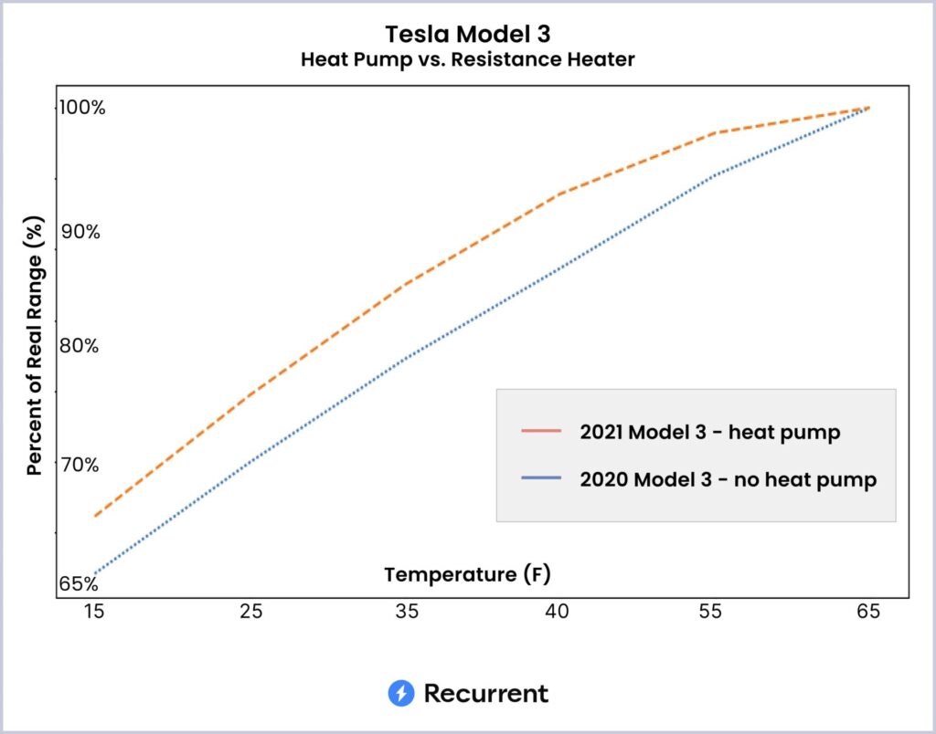 例えばテスラの場合、モデル3は2021年モデルイヤーのリフレッシュ(2020年末開始)からヒートポンプを搭載しています。下記リカンレント社のチャートは、両モデルの冬季性能差を示しています: