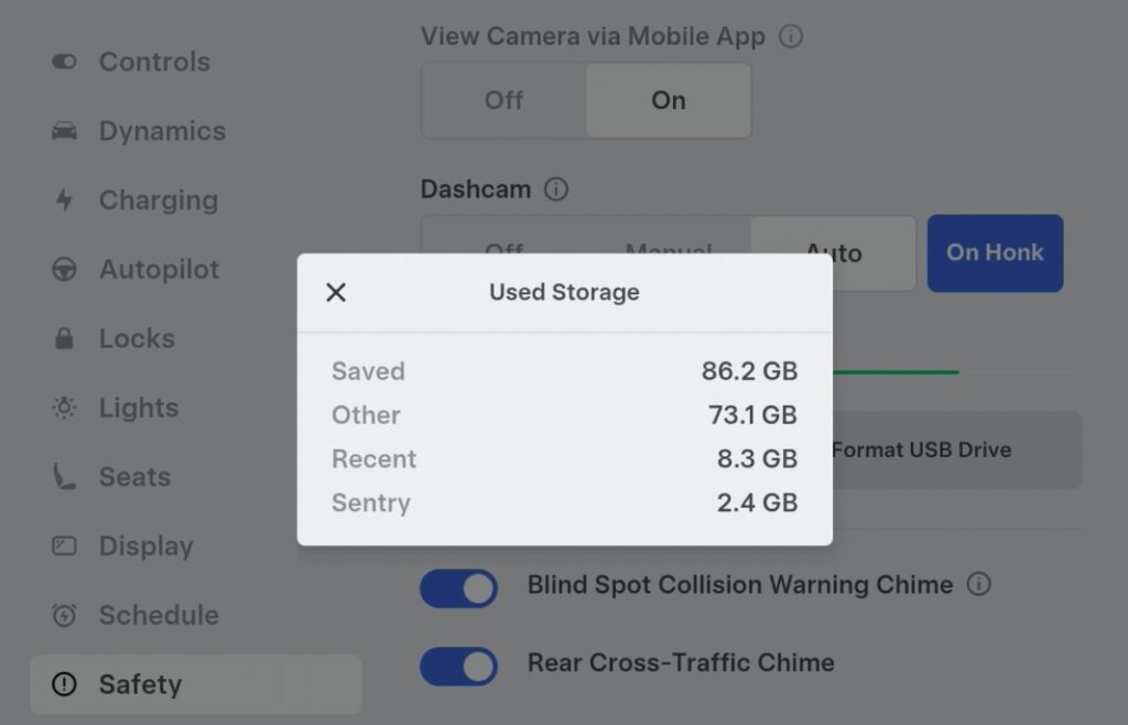 ドキュメント化されていない新しい機能の一つとして、USBドライブの空き容量を確認できる機能が追加されました。USBドライブをコンピュータに接続せずに、空き容量を直接確認できるようになりました。さらに、情報アイコン(i)をタップすると、ダッシュカム、セントリーモード、USB音楽など、どの機能が最も容量を消費しているかを確認できます。