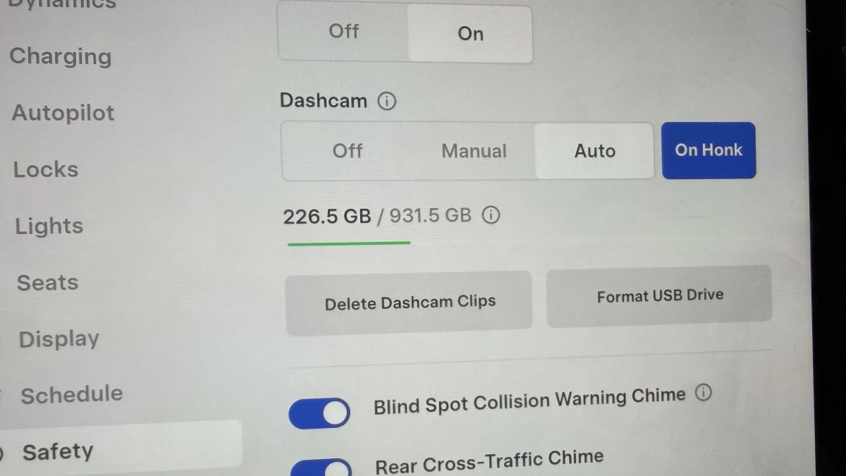 ダッシュカム用USBドライブのストレージ容量を確認できるようになりました。ダッシュカムが実装している容量とドライブの総容量を確認できます。ダッシュカムストレージを確認するには、[コントロール] > [安全] に進み、ダッシュカムまでスクロールしてください。