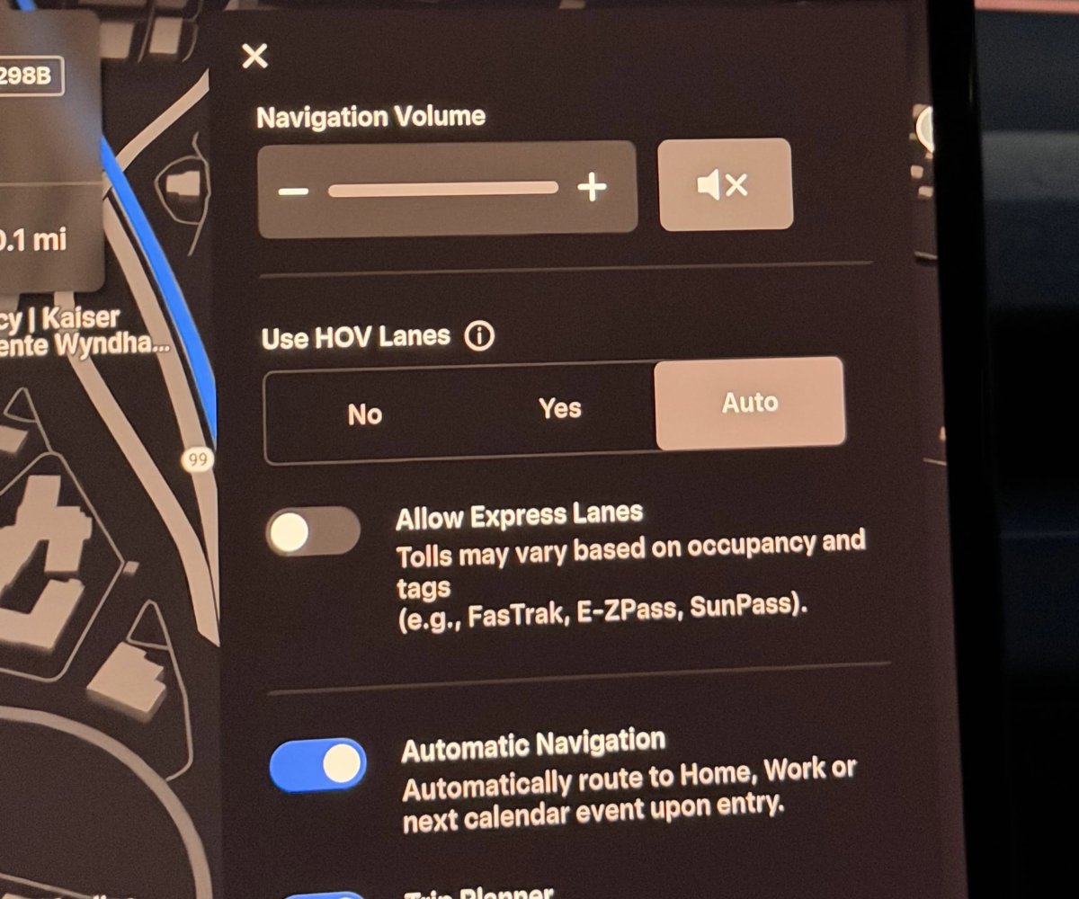 今回のアップデートにより、ナビゲーション設定でエクスプレスレーン利用のオン/オフを切り替えられる機能が追加されました。この機能は全車両で利用可能なわけではなく、テスラ社では現在もテスト段階にある可能性があります。