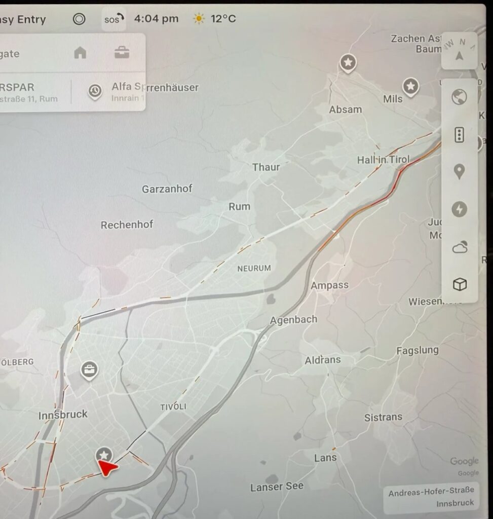 自宅/職場アイコンをナビゲーションボックス内に配置し、その下に上位2件の提案を表示するほか、テスラはすべてのお気に入り、自宅、職場の場所をマップ上に直接ピン留めするようになりました。これにより、地図を移動する際の方向感覚が大幅に改善され、友人の自宅やレストランなどお気に入りの場所の近くを通過した際にも一目瞭然となります。